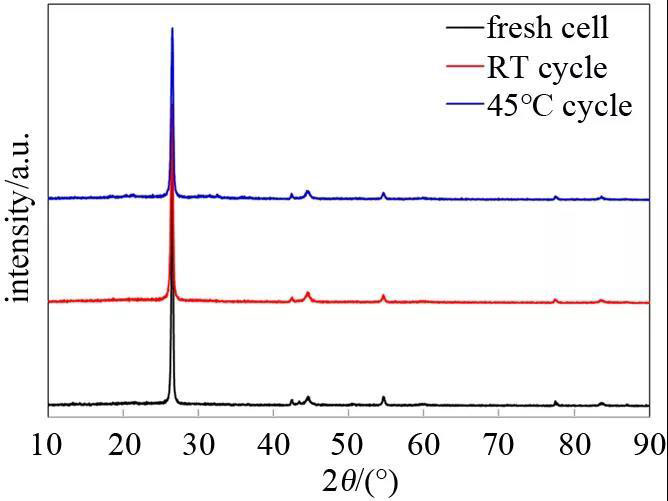 新鮮電池分別經(jīng)常溫循環(huán)以及高溫循環(huán)后,經(jīng)參數(shù)計(jì)算,材料的I(003)/I(104)的峰強(qiáng)比從1.5864分別降至1.4484和1.2274,c/a值也發(fā)生了不同程度的減小,說明循環(huán)后材料Li/Ni離子混排度增加[3],導(dǎo)致層狀結(jié)構(gòu)的晶片層變化;同時(shí)發(fā)現(xiàn)高溫循環(huán)后,(003)晶面層間距縮小0.3%,且(006)/(102)的△2θ收縮程度高達(dá)30%,說明高溫循環(huán)過程中,材料層狀結(jié)構(gòu)的完整程度明顯減弱,晶體結(jié)構(gòu)受到破壞,使得鋰離子遷移受阻,導(dǎo)致循環(huán)失效。而從負(fù)極材料的XRD結(jié)果顯示經(jīng)過常溫和高溫循環(huán)后,負(fù)極材料的整體結(jié)構(gòu)沒有發(fā)生變化,如圖4所示。