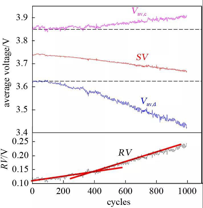 如圖2所示,當(dāng)電池循環(huán)到400次時(shí),RV上升斜率發(fā)生變化,其上升速率加快,而SV隨循環(huán)次數(shù)增加反而呈下降趨勢(shì),說明電芯衰減的原因主要來自于電芯內(nèi)阻的升高,而非活性Li損失。