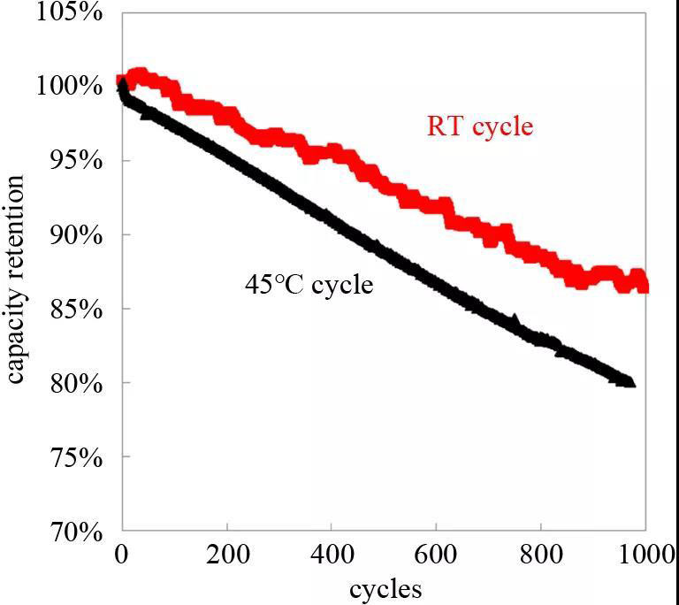 圖1為NCM811/石墨實(shí)驗(yàn)軟包電池常溫及45 ℃1 C/1 C循環(huán)曲線。電池常溫循環(huán)1000次后,容量保持率為87%;而45 ℃循環(huán)至1000次,容量保持率即衰減至80%。