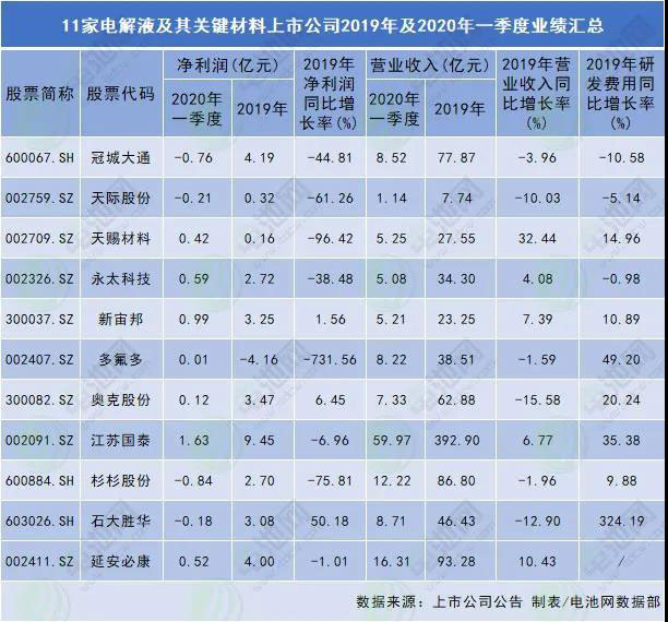 11家電解液及其關(guān)鍵材料上市公司2019年及2020年一季度業(yè)績匯總