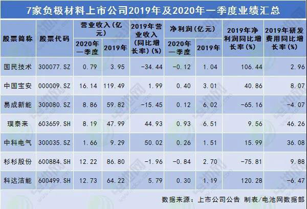 7家負(fù)極材料上市公司2019年及2020年一季度業(yè)績匯總