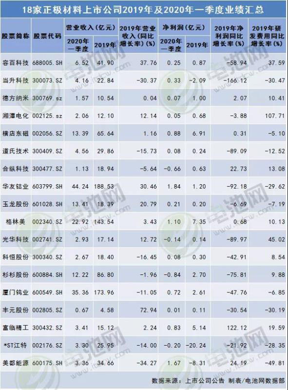 18家正極材料上市公司2019年及2020年一季度業(yè)績匯總