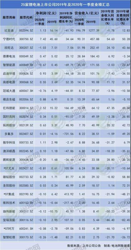 25家鋰電池上市公司2019年及2020年一季度業(yè)績匯總