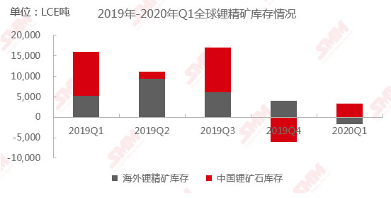 據(jù)計(jì)算,2020年第一季度全球鋰礦石庫存(LCE)新增1578噸,其中國(guó)內(nèi)庫存(LCE)新增為3343噸,海外鋰精礦去庫(LCE)1765噸。