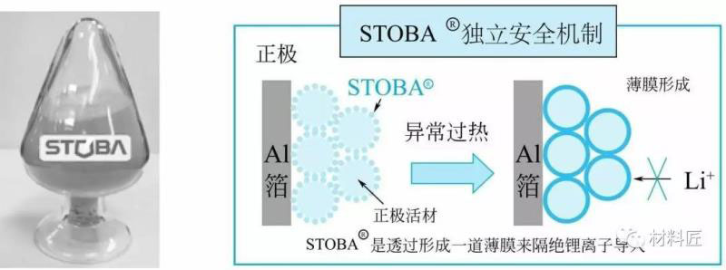 上圖采用一種納米級樹枝狀結(jié)構(gòu)的高分子化合物(STOBA)對NCM(424)進行涂層,當鋰電池發(fā)生異常,產(chǎn)生高溫時,會形成一道薄膜阻隔鋰離子間的流動,穩(wěn)定鋰電池,借以提高電池安全度。由下圖可見,針刺實驗時,正極材料未涂STOBA涂層的電池內(nèi)部溫度在幾秒鐘內(nèi)升至700℃,而用STOBA涂層正極材料的電池溫度最高只有150℃。