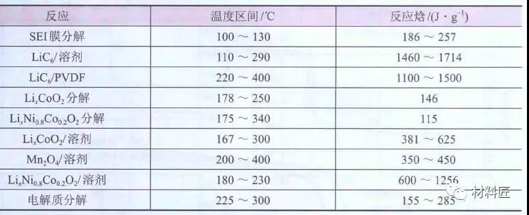 鋰離子電池各種放熱反應的溫度區(qū)間與反應焓