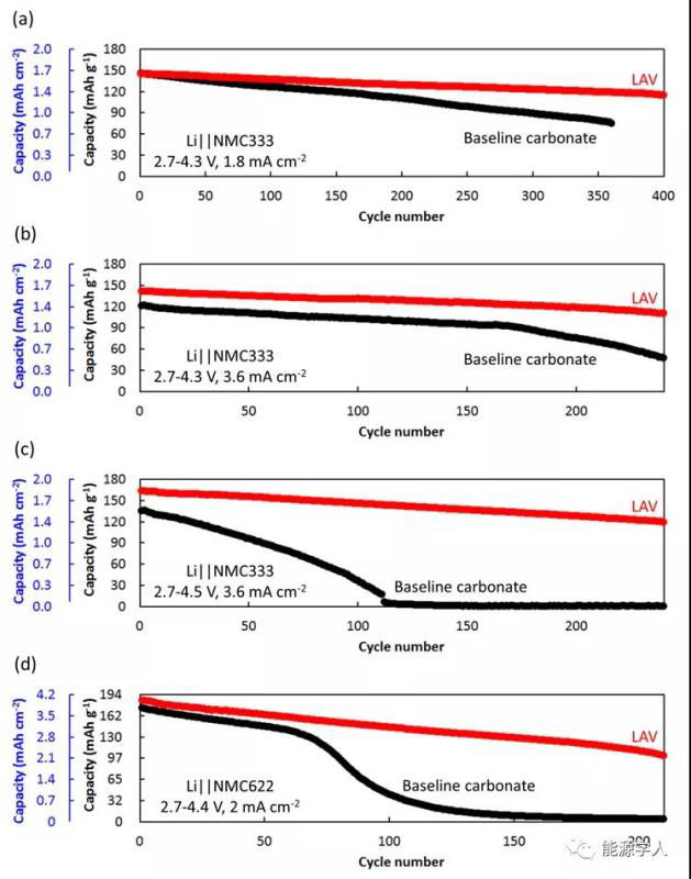 圖4. a–c) 分別使用10 M LAV 和常規(guī)碳酸酯電解液的Li||NMC333全電池在a) 電流密度1.8 mA cm-2,電壓窗口2.7-4.3 V, b) 電流密度3.6 mA cm-2,電壓窗口2.7-4.3 V, 和c) 電流密度3.6 mA cm-2,電壓窗口2.7-4.5 V條件下的循環(huán)性能;d) 分別使用10 M LAV 和常規(guī)碳酸酯電解液的Li||NMC622全電池在4 mAh cm-2正極負(fù)載量,電流密度2 mA cm-2和電壓窗口2.7-4.4 V條件下的循環(huán)性能。