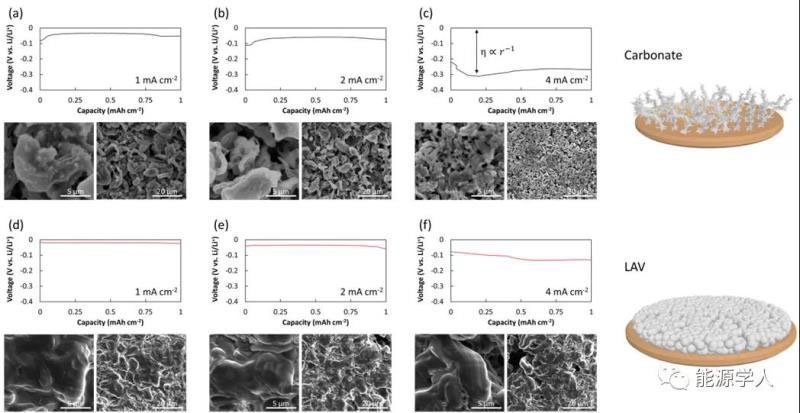 圖3. 在常規(guī)碳酸酯電解液中a) 1 mA cm-2, b) 2 mAcm-2, 和c) 4 mA cm-2條件下的鋰金屬沉積電壓曲線和SEM形貌圖,以及在10 M LAV電解液中d) 1 mA cm-2, e) 2 mA cm-2, 和f) 4 mA cm-2條件下的鋰金屬沉積電壓曲線和SEM形貌圖。