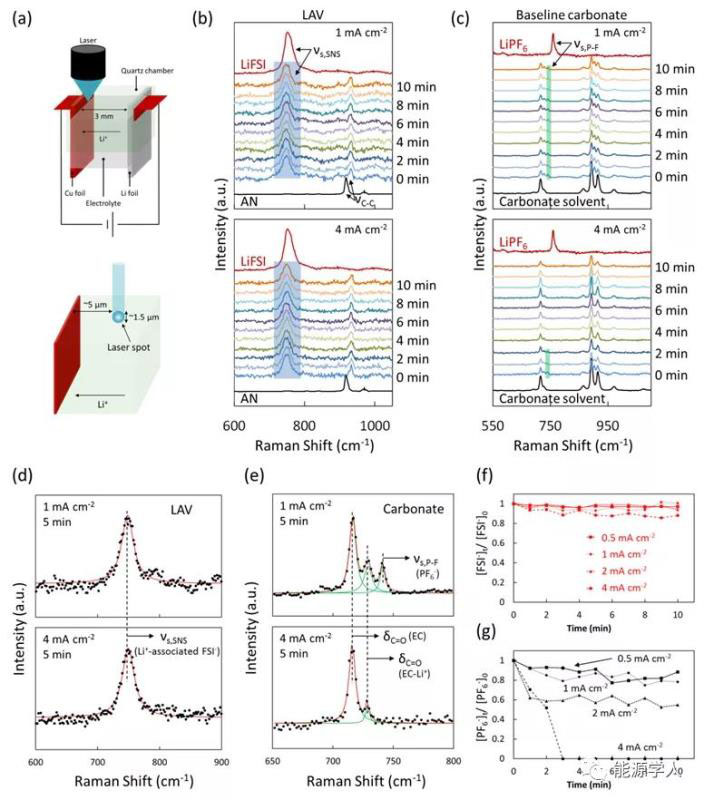圖2. a) 原位拉曼測(cè)試裝置的示意圖;b,c) 1 和 4 mA cm-2通電條件下b) LAV 和 c) 常規(guī)碳酸酯電解液的原位拉曼譜變化;d,e) 1 和 4 mA cm-2通電5分鐘時(shí)d) LAV 和 e) 常規(guī)碳酸酯電解液的拉曼譜分析;f,g) 不同電流密度下即時(shí)鹽陰離子濃度相對(duì)初始狀態(tài)的變化,包括f) 對(duì)應(yīng)10 M LAV電解液的[FSI-]t/[FSI-]0和g)對(duì)應(yīng)常規(guī)碳酸酯電解液的 [PF6-]t/[PF6-]0變化。