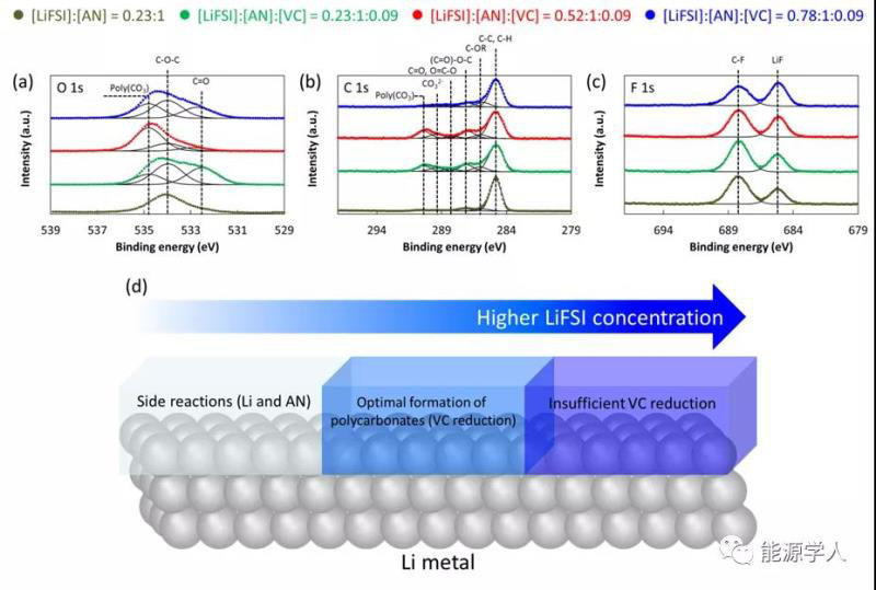 圖1. a–c) 在不同LAV電解液([LiFSI]:[AN]:[VC]= X:1:0.09 其中 X = 0.23, 0.52, and 0.78)以及不含VC的高鹽濃度乙腈電解液([LiFSI]:[AN] = 0.23:1)中循環(huán)后的鋰表面XPS譜,包括a) O 1s, b) C 1s, 和 c) F 1s 譜。d) 鋰金屬表面VC的氧化程度隨LiFSI鹽濃度變化的示意圖。