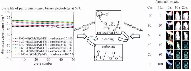 圖19 離子液體E(OMe)Pyrl-FSI與碳酸酯溶劑的二元電解液阻燃性測試及其在LiFePO4/Li電池體系中60 ℃高溫的循環(huán)性能