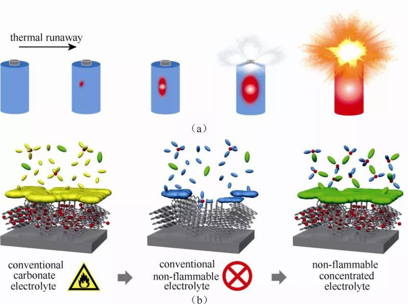 商品鋰離子電池具有能量和功率密度高、無記憶效應(yīng)、循環(huán)壽命長和環(huán)境友好等優(yōu)點(diǎn),其應(yīng)用正迅速從消費(fèi)電子品領(lǐng)域拓展到電動汽車和新能源儲能領(lǐng)域。然而,近年來,隨著鋰離子電池的大規(guī)模推廣應(yīng)用,在世界范圍內(nèi),每年都會發(fā)生大量與鋰離子電池濫用熱失控相關(guān)的安全事故,學(xué)術(shù)界和產(chǎn)業(yè)界也在不斷重視和加強(qiáng)對鋰離子電池安全性的探究和提高(圖1)。造成熱失控(冒煙、起火燃燒、爆炸)的濫用條件主要有機(jī)械濫用(如擠壓、針刺)、電濫用(如過充、內(nèi)部短路)和熱濫用(如過熱沖擊)等。從鋰離子電池?zé)崾Э剡^程的鏈?zhǔn)椒磻?yīng)定性描述圖中(圖2)可以看出,電解液在鋰離子電池?zé)崾Э剡^程中扮演的角色非常關(guān)鍵。商品鋰離子電池中通常采用碳酸酯基電解液,由鋰鹽(如六氟磷酸鋰LiPF6)與閃點(diǎn)低、高度可燃、電化學(xué)穩(wěn)定性差的碳酸酯溶劑(如碳酸乙烯酯EC、碳酸丙烯酯PC、碳酸二甲酯DMC、碳酸二乙酯DEC、碳酸甲乙酯EMC)組成。目前,從材料角度看,防止鋰離子電池?zé)崾Э仄鸹鹑紵ǖ陌踩愿倪M(jìn)策略眾多,如采用阻燃電解液、阻燃型耐熱收縮隔膜、固態(tài)電解質(zhì)、結(jié)構(gòu)穩(wěn)定性高的電極材料(如磷酸鐵鋰LFP)等。這其中,發(fā)展高安全性阻燃電解液是最經(jīng)濟(jì)簡單的策略,能夠有效降低鋰離子電池?zé)崾Э厝紵L(fēng)險(xiǎn)(概率),并極大降低熱失控帶來的人員財(cái)產(chǎn)傷害。本文將結(jié)合文獻(xiàn)資料首先介紹燃燒機(jī)理、阻燃機(jī)理和阻燃測試方法;再闡述鋰離子電池對阻燃電解液的性質(zhì)要求;對阻燃電解液進(jìn)行分類探討論述,包括基于阻燃添加劑的阻燃電解液、基于阻燃溶劑(共溶劑)的阻燃電解液、基于高濃度鋰鹽的阻燃電解液、基于離子液體的阻燃電解液和阻燃型凝膠聚合物電解質(zhì);最后,對高安全性阻燃電解液未來的研究方向進(jìn)行展望。