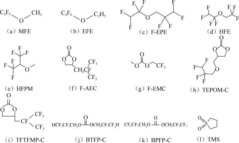 氟代醚類和氟代碳酸酯類有機(jī)化合物的特點(diǎn)是閃點(diǎn)高或者是沒有閃點(diǎn)。該類化合物作為阻燃溶劑是通過稀釋高揮發(fā)和易燃性共溶劑起作用,所以在阻燃電解液中占比較大(通常大于70%)。另外,借助氟元素的吸電子效應(yīng),該類氟代化合物溶劑分子更容易在碳基負(fù)極表面還原,優(yōu)化SEI膜,改進(jìn)阻燃電解液與電極材料的電化學(xué)兼容性,提高電池的性能。文獻(xiàn)報(bào)道過的用于鋰電池阻燃電解液的氟代醚有:甲基九氟丁醚[methyl nonafluorobutyl ether ,MFE,圖15(a)],乙基九氟丁醚[ethyl nonafluorobutyl ether,EFE,圖15(b)],DMTP[或稱為TMMP,圖12(m)],1,1,2,2-四氟乙基2,2,3,3-四氟丙醚[1,1,2,2-tetrafluoroethyl-2,2,3,3- tetrafluoropropyl ether,F(xiàn)-EPE,圖15(c)],1,1,2,2-四氟乙基-2,2,2-三氟乙基醚[1,1,2,2- tetrafluoroethyl 2,2,2-trifluoroethyl ether,HFE,圖15(d)],六氟異丙基甲醚[1,1,1,3,3,3-hexafluoroi- sopropyl methyl ether,HFPM,圖15(e)]。氟代碳酸酯的代表性化合物有:氟代環(huán)狀碳酸酯[F-AEC,圖15(f)],三氟乙基甲基碳酸酯[3,3,3-fluoroethylmethyl carbonate,F(xiàn)-EMC,圖15(g)],TFPOM-C[4-(2,2,3,3-tetrafluoropropo- xymethyl)-1,3-dioxolan-2-one,圖15(h)], TFTFMP- C[4-(2,3,3,3-tetrafluoro-2-trifluoromethyl-propyl)- 1,3- dioxolan-2-one,圖15(i)],雙(四氟丙基)碳酸酯[bis(2,2,3,3-tetrafluoro-propyl) carbonate,BTFP-C,圖15(j)],雙(五氟丙基)碳酸酯[bis(2,2,3,3,3- pentafluoro-propyl) carbonate,BPFP-C,圖15(k)]。最近,F(xiàn)AN等將氟代醚HFE、氟代碳酸酯F-EMC和FEC(氟代碳酸乙烯酯)聯(lián)用開發(fā)了一種耐高電壓的不燃全氟電解液[圖16(a)~(c)],在高鎳三元材料[NCM811,圖16(d)]和5 V磷酸鈷鋰[LCP, 圖16(e)]金屬鋰電池中取得了巨大的成功。相比非全氟電解液,該不燃電解液能夠保護(hù)金屬鋰片,抑制鋰枝晶的產(chǎn)生,減小電池短路風(fēng)險(xiǎn)[圖16(f)]。另外,閃點(diǎn)較高,氧化穩(wěn)定性高的環(huán)丁砜[sulfolane,TMS,圖15(l)],己二腈(adiponitrile,ADN)也被用作阻燃電解液的主溶劑。