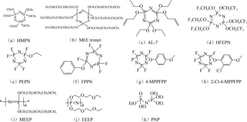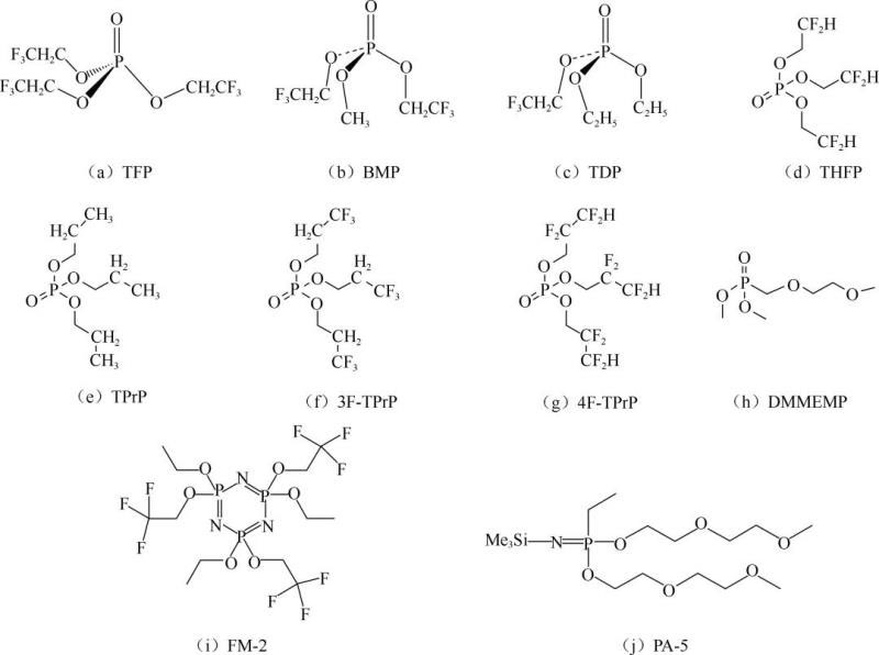 研究最早的短碳鏈烷基磷酸酯類阻燃添加 劑,如磷酸三甲酯[trimethyl phosphate,TMP,圖4(c)]、磷酸三乙酯[triethyl phosphate,TEP,圖4(i)]、磷酸三丁酯[tributylphosphate,TBP,圖4(b)]等,捕捉燃燒自由基能力強(qiáng),阻燃效果良好。但是這些烷基磷酸酯通常黏度較大且與電極材料(尤其碳基負(fù)極)兼容性差,加入基液后在提高電解液阻燃性的同時會降低電解液的離子電導(dǎo)率并極大縮短電池循環(huán)壽命。提高烷基磷酸酯電化學(xué)穩(wěn)定性的途徑有:① 芳香基團(tuán)(苯基)取代烷基基團(tuán),如磷酸三苯酯[triphenylphosphate,TPP,圖4(a)]、4-異丙基苯基二苯基磷酸酯[4-isopropyl phenyl diphenyl phosphate,IPPP,圖4(d)]、三(4-甲氧基苯基)磷酸酯[tri-(4-methoxythphenyl) phosphate,TMPP,圖4(e)]、磷酸甲苯二苯酯[cresyl diphenyl phosphate,CDP,圖4(f)]、二苯基磷酸辛酯[diphenyl octyl phosphate,DPOF,圖4(g)];② 增加烷基基團(tuán)的碳含量,如磷酸三辛酯[trioctyl Phosphate,TOP,圖4(h)];③ 采用環(huán)狀磷酸酯,如乙烯乙基磷酸酯[ethylene ethyl phosphate,EEP,圖4(j)];最近,TSUBOUCHI等通過雙三氟甲烷磺酰亞胺鉀(KTFSA)添加劑修飾負(fù)極SEI膜來提高TMP基(50%,體積百分?jǐn)?shù))阻燃電解液與石墨負(fù)極的兼容性、庫侖效率提升明顯。LIU等設(shè)計(jì)了一種非常新穎的熱“智能”阻燃的無紡布靜電紡絲隔膜,靜電紡絲纖維由TPP內(nèi)核和偏氟乙烯-六氟丙烯共聚物(PVDF-HFP)外殼組成,鋰離子電池正常運(yùn)行時,TPP不會對電池的循環(huán)性能造成影響,但當(dāng)電池過熱時,PVDF-HFP外殼熔斷破碎,釋放出TPP阻燃劑,捕捉燃燒自由基,從而阻止鋰離子電池?zé)崾Э厝紵ā?
