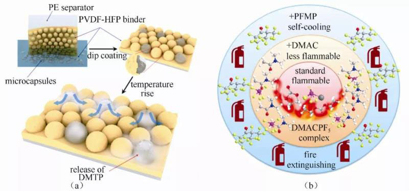 圖13 (a)將包裹有DMTP的PMMA聚合物微膠囊用PVDF-HFP黏結(jié)劑固定在聚乙烯隔膜上;(b)具有雙重保護(hù) 機(jī)制的復(fù)合電解液