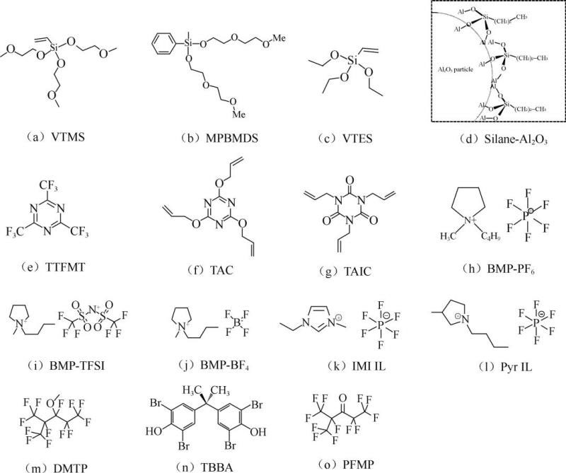 (1)發(fā)展電極界面兼容性優(yōu)異的多功能阻燃添加劑或阻燃溶劑,即不僅具有阻燃效果,而且具有界面成膜功能;或?qū)⒆枞紕┡c功能成膜添加劑聯(lián)用,發(fā)揮協(xié)同作用。