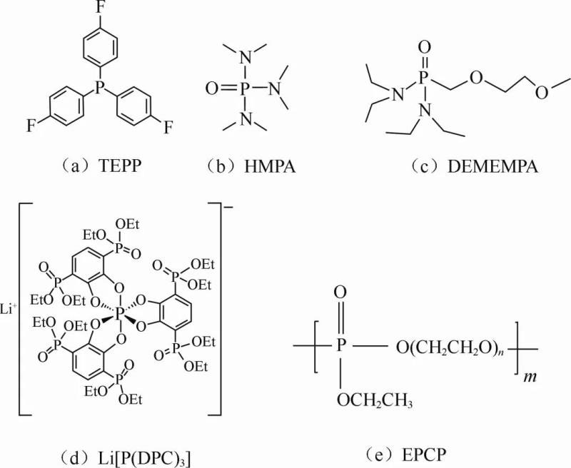 已報(bào)道的含磷阻燃添加劑還有三(4-氟苯基)磷化氫[tris(4-fluorophenyl) phosphine,TFPP,圖11(a)、六甲基磷酰三胺[hexamethylphosphoramide,HMPA,圖11(b)]、二(N,N-二乙基)甲氧基乙氧基甲基磷酰胺[bis(N,N-diethyl)(2-methoxyethoxy) methylphos- phonamidate,DEMEMPA,圖11(c)]、富含磷?;淖枞茧x子-新型阻燃鋰鹽[Li[P(DPC)3],圖11(d)]、聚(磷酸乙酯-乙二醇)共(寡)聚物[EPCP,圖11(e)]。值得注意的是,最近,WANG等將離子傳導(dǎo)性優(yōu)異的EO片段嵌入到磷酸酯中形成具有阻燃性EPCP寡聚物,該寡聚物添加量為15%時,電解液完全不燃,且電解液的離子電導(dǎo)率不受EPCP加入影響。另外EPCP還有利于電極材料界面的穩(wěn)定,因此,采用鈷酸鋰正極的鋰離子電池(LiCoO2/Li)循環(huán)性能和倍率性能均有所提升。