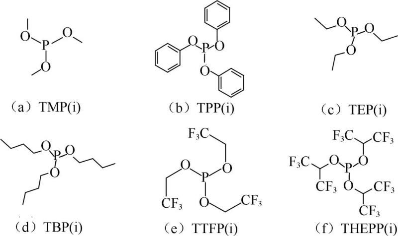 亞磷酸酯也是一類非常重要的阻燃添加 劑,如亞磷酸三甲酯[trimethyl phosphite,TMP(i),圖6(a)]、亞磷酸三苯酯[triphenylphosphite,TPP(i),圖6(b)]、亞磷酸三乙酯[triethyl phosphite,TEP(i),圖6(c)]、磷酸三丁酯[tributylphosphite,TBP(i),圖6(d)]、三(2,2,2-三氟乙基)亞磷酸鹽[tris(2,2,2-trifluoroethyl) phosphite,TTFP(i),圖6(e)]、亞磷酸三(1,1,1,3,3,3-六氟-2-丙基)酯[tris(1,1,1,3,3,3-hexafluoropropan-2-yl) phosphite,THFPP(i),圖6(f)]等。亞磷酸酯類化合物相對于磷酸酯類化合物更穩(wěn)定,這是因?yàn)镻—O單鍵反應(yīng)活性低于P==O雙鍵。另外,亞磷酸酯類化合物更有利于形成穩(wěn)定性高的SEI膜,能夠通過使五氟化磷(PF5)失活而穩(wěn)定鋰鹽六氟磷酸鋰(LiPF6),也能消除電解液中游離的氫氟酸(HF)。WANG等[49]將氟代亞磷酸酯TTFP(i)基的碳酸酯電解液應(yīng)用于高能量密度的鋰硫電池中,當(dāng)TTFP(i)的濃度大于10%時,碳酸酯電解液阻燃甚至不燃。最重要的是,鋰硫電池的電化學(xué)性能得到了極大的提升,10 C倍率下循環(huán)750圈容量幾乎沒有損失,而且容量高達(dá)800 mA·h/g。PIRES等將TTFP(i)用作正極成膜添加劑提高富鋰正極材料的循環(huán)穩(wěn)定性,并且可以明顯改善電解液的熱穩(wěn)定性。