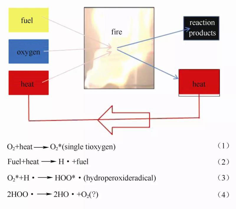 燃燒過程是一個復(fù)雜的化學(xué)反應(yīng)過程(圖3),需同時具備3個重要條件,即熱(heat)、氧化劑(oxidizer)和燃料(fuel),燃料是燃燒的物質(zhì),氧化劑是產(chǎn)生氧氣讓燃料可以燃燒的物質(zhì),而熱是驅(qū)動燃燒過程的能量。維持燃燒通常依賴自由基的產(chǎn)生,基態(tài)O2吸收熱量產(chǎn)生反應(yīng)活性非常高的單線態(tài)氧(singlet oxygen, O2*),如式(1)所示;與此同時,有機(jī)質(zhì)(燃料)吸收熱量產(chǎn)生氫自由基(H?),如式(2)所示;O2*與H?結(jié)合產(chǎn)生氫過氧化物自由基(HOO*?),如式(3)所示;HOO*?分解產(chǎn)生氫氧自 由基(HO?),如式(4)所示。這些自由基壽命 極短但反應(yīng)活性非常強(qiáng),會產(chǎn)生大量的熱/火焰??傊?,這種自由基機(jī)制意味著氫自由基(H?)、單線態(tài)氧(O2*)和氫氧自由基(HO?)在維持燃燒過程中扮演著極為重要的角色。