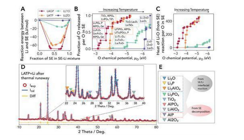 研究團(tuán)隊選取了四種主流的氧化物固態(tài)電解質(zhì)材料為研究對象,即具有鈉超離子導(dǎo)體結(jié)構(gòu)(NASICON)的Li1.5Al0.5Ge1.5(PO4)3(LAGP)和Li1.4Al0.4Ti1.6(PO4)3(LATP),鈣鈦礦結(jié)構(gòu)的Li3xLa2/3-xTiO3(LLTO),以及石榴石結(jié)構(gòu)的Li6.4La3Zr1.4Ta0.6O12(LLZO)。采用絕熱加速量熱儀定量測定了它們與金屬鋰發(fā)生熱失控反應(yīng)的特征溫度、產(chǎn)熱速率和產(chǎn)熱量。結(jié)果表明, LAGP和LATP與金屬鋰在加熱過程中均發(fā)生了明顯熱失控并伴隨著大量放熱,LLTO出現(xiàn)了輕微放熱現(xiàn)象,而LLZO沒有明顯產(chǎn)熱。隨后研究團(tuán)隊結(jié)合DFT熱力學(xué)計算發(fā)現(xiàn),固態(tài)電解質(zhì)與金屬鋰發(fā)生化學(xué)反應(yīng)產(chǎn)生的熱量不足以引起熱失控,熱失控的原因很有可能是固態(tài)電解質(zhì)與金屬鋰接觸時界面化學(xué)反應(yīng)產(chǎn)生的熱量導(dǎo)致氧化物固態(tài)電解質(zhì)材料自身分解產(chǎn)生氧氣,氧氣進(jìn)一步與金屬鋰發(fā)生化學(xué)反應(yīng)導(dǎo)致劇烈產(chǎn)熱。研究團(tuán)隊進(jìn)一步通過對反應(yīng)產(chǎn)物進(jìn)行精確的XRD物相分析證實了這一猜想。以上研究表明了一些被廣泛認(rèn)為具有較高結(jié)構(gòu)熱穩(wěn)定性的固態(tài)電解質(zhì)材料,在與金屬鋰負(fù)極接觸后,高溫下依然可能發(fā)生熱失控反應(yīng)。這表明材料自身的熱穩(wěn)定性并不能代表其在電池內(nèi)整體的熱穩(wěn)定性,需要將固態(tài)電解質(zhì)與電池內(nèi)其他活性材料與非活性材料的反應(yīng)特性考慮在內(nèi)。