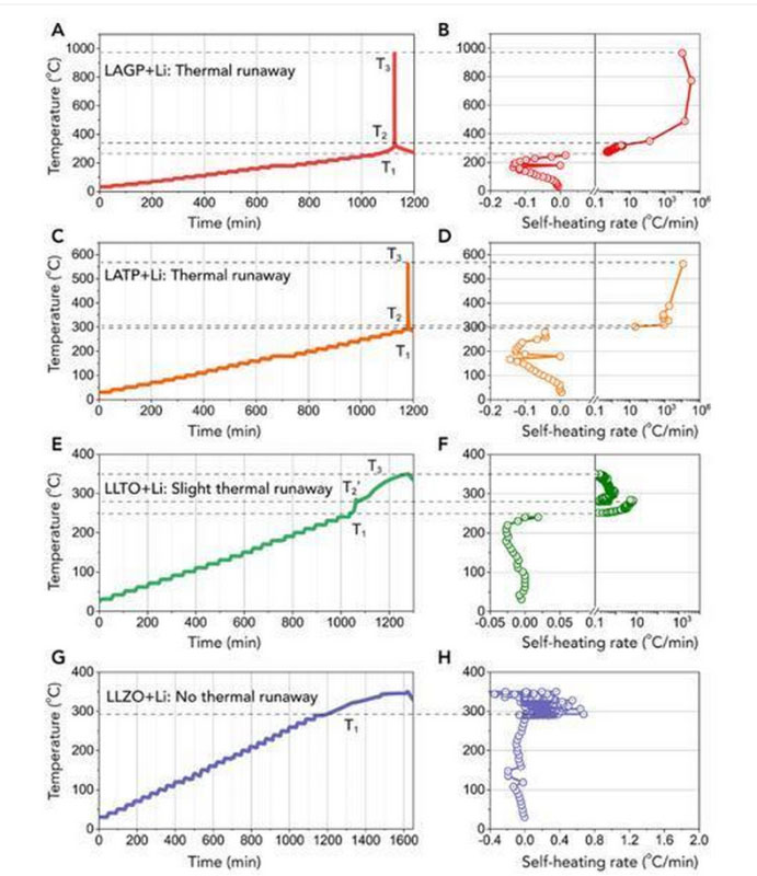 圖 1. 四種氧化物固態(tài)電解質(zhì)與金屬鋰接觸下的ARC測試結(jié)果。
