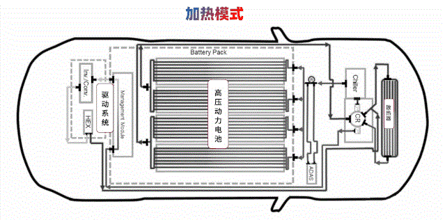 沒(méi)有專(zhuān)用PTC的電池系統(tǒng),主要適用于南方等溫度比較高的區(qū)域。電池加熱就需要非專(zhuān)用PTC,也就是通過(guò)系統(tǒng)換熱來(lái)實(shí)現(xiàn)電池加熱。比如先利用空調(diào)PTC加熱座艙冷卻液,再通過(guò)熱交換器,將座艙回路冷卻液中的熱量,轉(zhuǎn)移到電池包中。