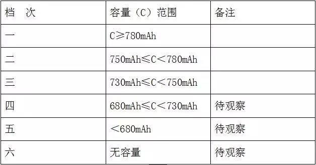 按如下檔次對電池進(jìn)行分容: