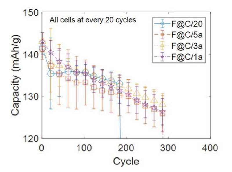雖然不同的化成電流會(huì)導(dǎo)致不同的化成容量發(fā)揮,但是在循環(huán)過(guò)程中我們發(fā)現(xiàn)這些電池之間沒(méi)有明顯的差距,在1C/1C倍率下循環(huán)的幾種電池的容量發(fā)揮和循環(huán)穩(wěn)定性幾乎相同,表明不同電流下化成的電池,最終負(fù)極表面都形成了穩(wěn)定的SEI膜。因此作者認(rèn)為采用上述的分段式快速化成制度能夠在化成過(guò)程中部分的形成SEI膜,然后在鋰離子電池使用的前幾次循環(huán)中最終完成穩(wěn)定SEI膜的構(gòu)建,從而在大幅壓縮化成時(shí)間、降低成本的同時(shí)還能夠獲得相近的循環(huán)壽命。