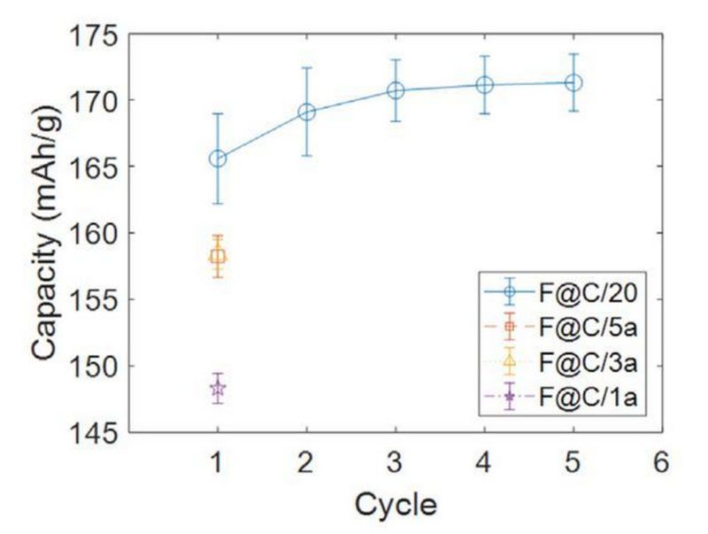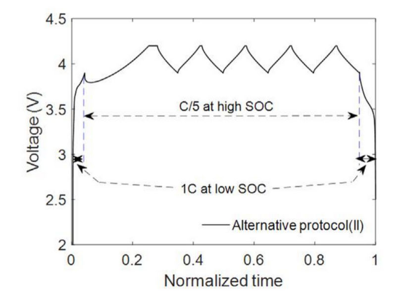 為了壓縮化成時(shí)間,降低生產(chǎn)成本,美國(guó)橡樹嶺國(guó)家實(shí)驗(yàn)室在1.5Ah的NCM/石墨軟包鋰離子電池上設(shè)計(jì)了一種快速化成的制度(如下圖所示),在這一制度下首先以較大的電流(1C)將鋰離子電池充電到3.9V,然后以C/5倍率在3.9-4.2V的范圍內(nèi)對(duì)鋰離子電池進(jìn)行充放電循環(huán),最后將電池放電到3.0V,相比于以0.05C倍率進(jìn)行3次循環(huán),該制度下電池的化成時(shí)間僅需要14h,化成速度提高8.5倍。這一化成制度的設(shè)計(jì)思路主要是將負(fù)極在較低電勢(shì)范圍內(nèi)時(shí),充電電流盡量盡可能的小,以使負(fù)極形成更為致密和穩(wěn)定的SEI膜。