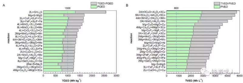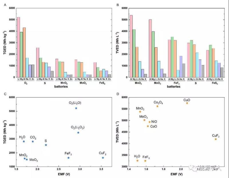 根據(jù)熱力學(xué)計算,同時考慮兼具高理論質(zhì)量能量密度和理論體積能量密度,H2O/Li、S/Li、H2O/Al、H2O/Mg、S/Mg、CuF2/Li、FeF3/Li、MnO2/Li、MoO3/Li等電池具有較強的儲能能力。具體而言,鋰電池具有最高的理論質(zhì)量能量密度,而鋁電池具有最高的理論體積能量密度。除了基于轉(zhuǎn)換反應(yīng)的電池外,其他電池如富鋰氧化物和氟碳電池也可以考慮作為高理論質(zhì)量能量密度和理論體積能量密度的替代方案。憑借高的理論極限,基于轉(zhuǎn)換反應(yīng)的電池是能量存儲系統(tǒng)的長期目標。通過對電池能量密度的系統(tǒng)計算和分析,闡明了電池設(shè)計的局限性,也為下一代儲能技術(shù)的發(fā)展指明了方向。