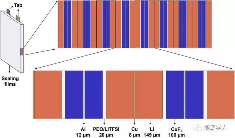 圖3. 以CuF2/Li為例,基于PEO/LiTFSI電解質(zhì)的軟包電池結(jié)構(gòu)示意圖