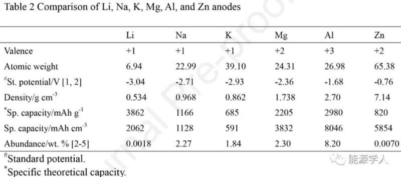 表2. Li、Na、K、Mg、Al、Zn的性能比較