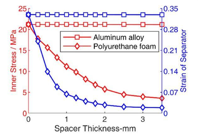 下圖為采用不同厚度的聚氨酯泡沫和Al板作為緩沖層時(shí),電池發(fā)生2000um不可逆形變時(shí)電池內(nèi)部的壓力和隔膜應(yīng)變情況,從圖中能夠看到聚氨酯泡沫板的厚度對(duì)于電池內(nèi)部的壓力有著顯著的影響,當(dāng)泡沫板厚度為0時(shí)(電池組為完全剛性),電池內(nèi)部的壓力可以達(dá)到21.21MPa,電池隔膜的應(yīng)變也將達(dá)到0.33,這會(huì)嚴(yán)重的降低隔膜的離子電導(dǎo)率,但是如果將泡沫板的厚度提升至1mm,電池內(nèi)部的壓力就可以下降到11.19MPa,同時(shí)隔膜的應(yīng)變也能夠降低到0.064,能夠有助于減少因隔膜變形而導(dǎo)致的阻抗增加。