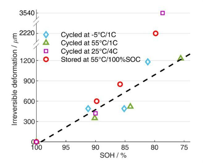 同時(shí)從圖中我們能夠注意到在壽命的末期,電池的不可逆形變普遍達(dá)到了1000um,部分電池的不可逆形變更是達(dá)到了3540um,達(dá)到了電池厚度的45.3%,這對(duì)于電池組的設(shè)計(jì)會(huì)是一個(gè)非常大的挑戰(zhàn)。