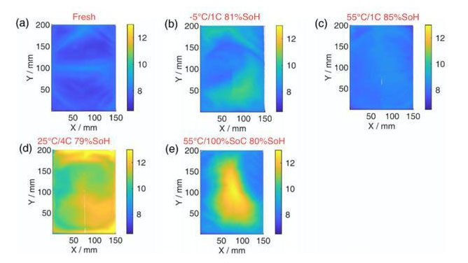 下圖為在不同模式下衰降后的電池的不可逆形變照片,從圖中能夠看到新鮮電池、-5℃/1C循環(huán)和55℃/1C循環(huán)的電池表面都非常平整,但是25℃/4C和55℃/100%SoC存儲(chǔ)的電池的形變則表現(xiàn)出了非常明顯的不均勻現(xiàn)象,例如25℃/4C循環(huán)的電池的邊緣區(qū)域的厚度就要明顯的大于中間位置的厚度,這主要是由于在大電流循環(huán)的過(guò)程中,極片邊緣位置的電流分布更大,從而導(dǎo)致邊緣位置產(chǎn)生了更厚的分解層。而55℃/100%SoC存儲(chǔ)的電池,中間的厚度則要顯著高于電池邊緣位置,這主要因?yàn)殡姵卦诖鎯?chǔ)過(guò)程中產(chǎn)生的氣體引堆積造成的。