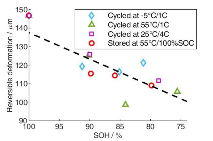 下圖為不同老化制度的可逆形變,從圖中可以看到盡管不同老化制度的電池衰降模式上存在一定的區(qū)別,但是在電池的可逆形變上則幾乎相同,這主要是電池的可逆形變主要取決于每個(gè)循環(huán)有多少Li能夠從正極轉(zhuǎn)移到負(fù)極(或從負(fù)極轉(zhuǎn)移到正極),而這直接與電池的SoC狀態(tài)有關(guān)。
