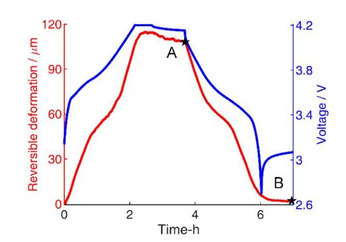 下圖為C/3倍率下充放電過(guò)程中電池的可逆形變,可以看到在恒流充電的過(guò)程電池的可逆形變緩慢升高,在進(jìn)入恒壓充電的階段后電池的形變開始出現(xiàn)輕微的下降,在隨后的靜置階段電池的形變繼續(xù)輕微下降,在恒流放電階段電池的形變開始出現(xiàn)持續(xù)的下降,直到回到最初的狀態(tài)。