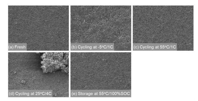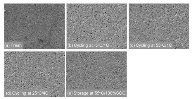 下圖為不同老化制度測(cè)試后的負(fù)極的SEM圖,從圖中能夠看到新鮮的負(fù)極,55℃/1C循環(huán)的負(fù)極和55℃/100%SoC存儲(chǔ)的負(fù)極形貌上幾乎是相同的,但是-5℃/1C循環(huán)的負(fù)極表面觀測(cè)到了大量的分解產(chǎn)物,作者認(rèn)為這主要是由于低溫循環(huán)引起的負(fù)極析鋰,加劇了電解液分解導(dǎo)致的。同時(shí)25℃/4C循環(huán)的負(fù)極表面也觀察到了大量的電解液分解產(chǎn)物,這可能是由于在大倍率下循環(huán)導(dǎo)致的負(fù)極SEI膜破壞,引起電解液分解加劇導(dǎo)致的。
