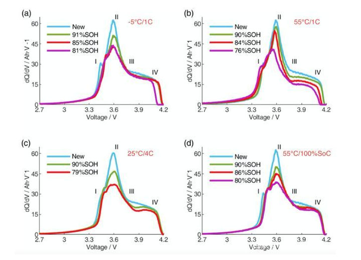 下圖為不同制度衰降的電池在C/3倍率放電的dQ/dV曲線,從圖中能夠看到一共有四個(gè)特征峰,其中3.4V附近的特征峰1和3.7V附近的特征峰3對(duì)應(yīng)的為石墨材料的相變,4.1V附近的4號(hào)特征峰對(duì)應(yīng)的為NCM111材料的相變,3.59V附近的2號(hào)特征峰則為NCM111正極和石墨負(fù)極混合而成。