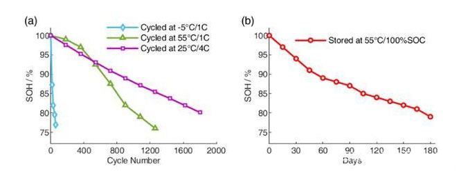 下圖展示了四個(gè)分組電池的容量衰降情況,從下圖a可以看到在-5℃下1C循環(huán)的電池衰降速度最快,僅僅60次循環(huán)后容量就下降到了77%,其次為55℃下1C循環(huán)的電池,在經(jīng)過(guò)1260次循環(huán)電池的容量保持率下降到了76%,而在25℃下4C循環(huán)的電池在經(jīng)過(guò)1800次循環(huán)后還能夠剩余79%的容量,而55℃下100%DOD存儲(chǔ)的電池在經(jīng)過(guò)180天的存儲(chǔ)后,剩余容量為80%。