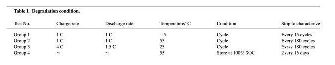進(jìn)行容量測(cè)試后,電池被分為四組按照下表所示的制度進(jìn)行循環(huán)和存儲(chǔ)。