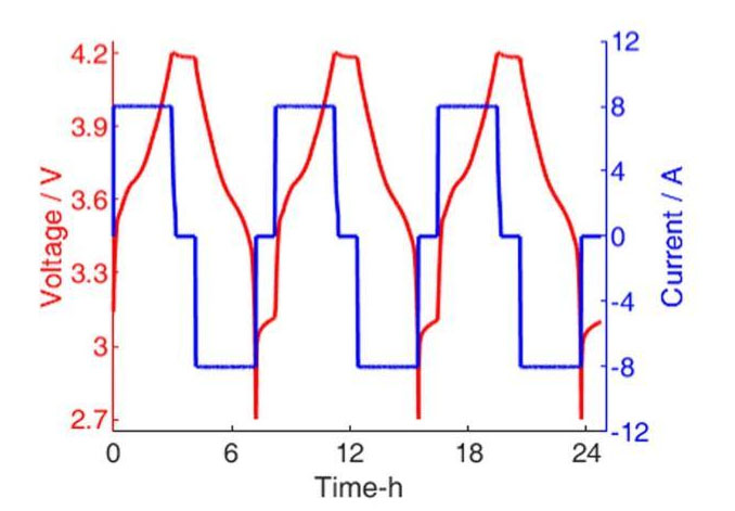 實(shí)驗(yàn)中采用的電池為24Ah的軟包電池,正極為NCM111,負(fù)極為石墨,電池的尺寸為200 mm × 150 mm × 7.7 mm。為了確定電池的容量,作者采用新威爾的充放電測(cè)試設(shè)備在25℃的環(huán)境下對(duì)電池進(jìn)行了容量測(cè)試,電池首先以C/3的倍率充電到4.2V,然后4.2V恒壓充電至電流下降到C/20,在靜置1h后電池再以C/3的倍率放電到2.7V,上述測(cè)試進(jìn)行3次,以最后一次容量為電池的容量。