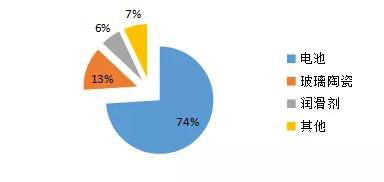 2015年開始中國(guó)動(dòng)力電池市場(chǎng)爆發(fā),碳酸鋰的需求逐年上升,截至2018年電池類鋰需求占比已達(dá)74%。