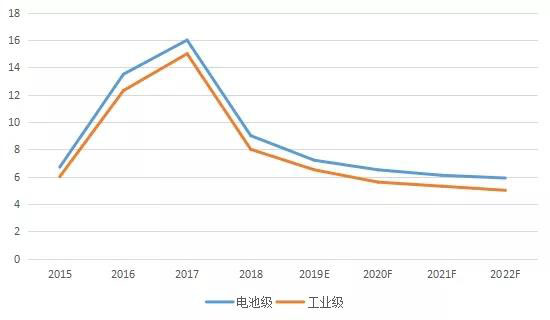 預(yù)計(jì)未來(lái)隨著各大企業(yè)的擴(kuò)張和鹵水提鋰技術(shù)的進(jìn)步,其價(jià)格到2022年將跌至5萬(wàn)元/噸(工業(yè)級(jí)),6萬(wàn)元/噸(電池級(jí))。