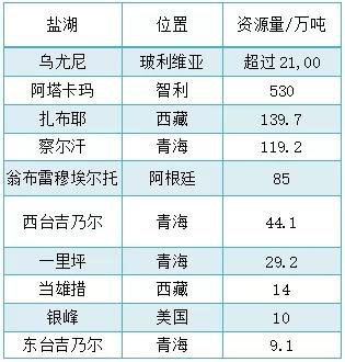 全球主要鹽湖鹵水型鋰礦床(資源量以碳酸鋰 計(jì))