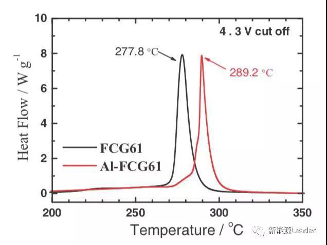 在提升NCM材料循環(huán)穩(wěn)定性的同時(shí),Al摻雜還改善了NCM材料的熱穩(wěn)定性。從下圖我們能夠看到FCG61材料的熱分解溫度為278℃左右,熱分解釋放熱量為1070J/g,而經(jīng)過(guò)Al摻雜后熱分解溫度提高到了290℃,熱分解放熱量也降低到了889J/g,對(duì)于提升鋰離子電池的安全性具有重要的意義。