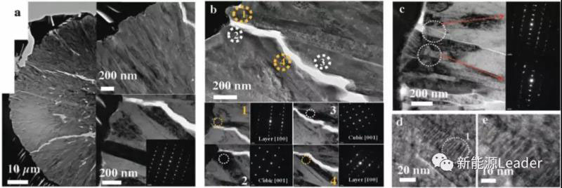下圖為Al-FCG61材料在經(jīng)過(guò)3000次循環(huán)后的顆粒結(jié)構(gòu),從圖中能夠看到經(jīng)過(guò)長(zhǎng)期循環(huán)后在顆粒內(nèi)部沿著晶界產(chǎn)生了一些裂紋,從顆粒的表面一直延伸到顆粒的中心位置,對(duì)裂紋兩側(cè)的晶粒進(jìn)行分析發(fā)現(xiàn)存在兩種晶體結(jié)構(gòu),分別是下圖b中1和4位置的層狀結(jié)構(gòu),2和3位置的巖鹽結(jié)構(gòu),同時(shí)存在兩種不同晶體結(jié)構(gòu)導(dǎo)致了顆粒內(nèi)部應(yīng)變不均,進(jìn)一步促進(jìn)了裂紋的生長(zhǎng)。