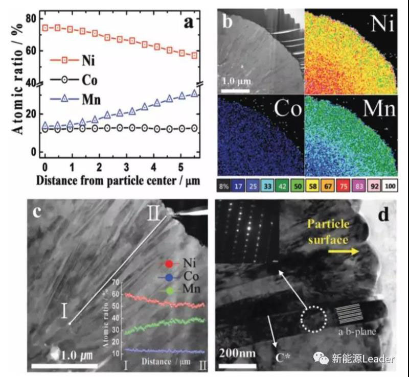 下圖a為梯度濃度材料中過(guò)渡金屬元素Ni、Co和Mn元素在顆粒直徑方向的濃度分布,能夠看到顆粒中心位置的Ni元素的含量為75%,在顆粒的表面Ni元素的濃度降低到了57%。而Mn元素的濃度則從中心位置的14%逐漸提高到顆粒表面的30%,而Co元素的濃度則幾乎沒(méi)有發(fā)生顯著的改變。從下圖b的EDS圖片中我們也能夠看到,Ni元素的分布明顯呈現(xiàn)中心濃度大,表面濃度低的狀態(tài),Mn元素則正好相反,中心濃度低,表面濃度高,而Co元素則在顆粒內(nèi)部分布比較均勻。