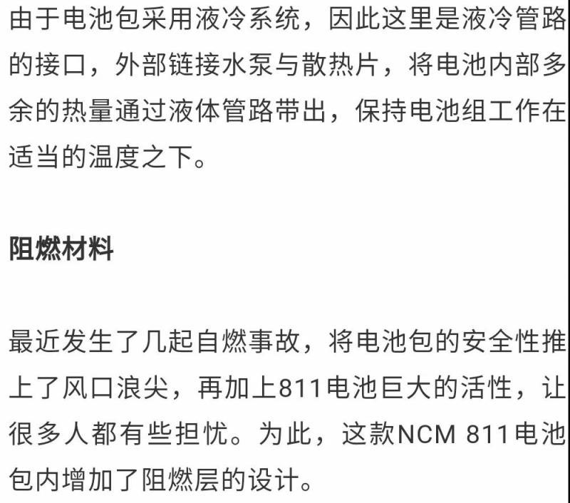 電池包在位于電芯的上部增加了這個阻燃層,如果萬一電芯發(fā)生燃燒,那么阻燃層會拖延電芯部分的火勢,向電池上部外殼及車身燃燒的進(jìn)度,增加乘員離開車輛的時間。這一個阻燃層重量約2.5公斤。