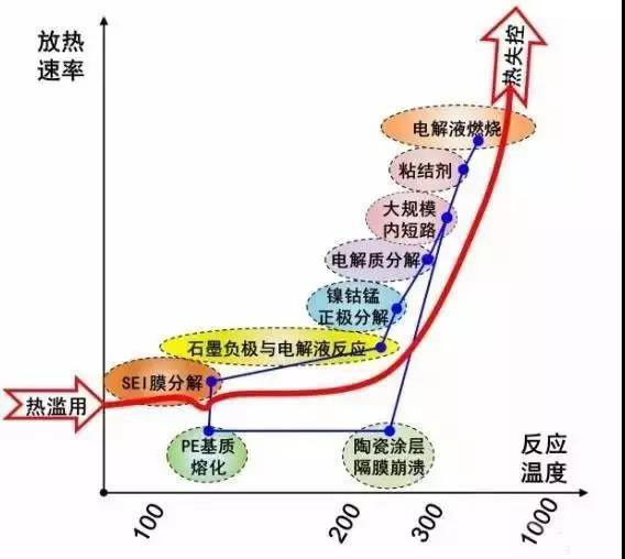 熱失控是鋰電池危害程度最高且難以預(yù)測的風(fēng)險,當(dāng)電芯受到外力破壞引起短路或內(nèi)部發(fā)生短路、過充情況時,電芯內(nèi)部的溫度便隨之上升,一旦升至130度,SEI膜便開始崩解,并造成有機(jī)電解液直接與高活性正負(fù)極接觸,因而大量發(fā)生分解放熱反應(yīng),導(dǎo)致溫度與內(nèi)壓提速上升、大量氣體產(chǎn)生造成電池快速膨脹,到達(dá)臨界溫度后正極崩解,釋放出更多熱能及氧氣,諸多因素迭加后造成升溫、分解、放熱的連鎖反應(yīng)加劇,終至起火爆炸。